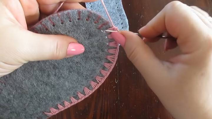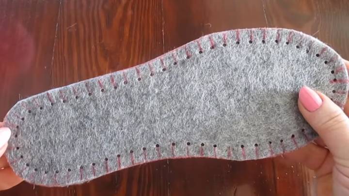 Совместите войлочную стельку со стелькой потолще, для подошвы. Проколите и прошейте вручную капроновой нитью для обуви, чтобы скрепить. Основа готова!