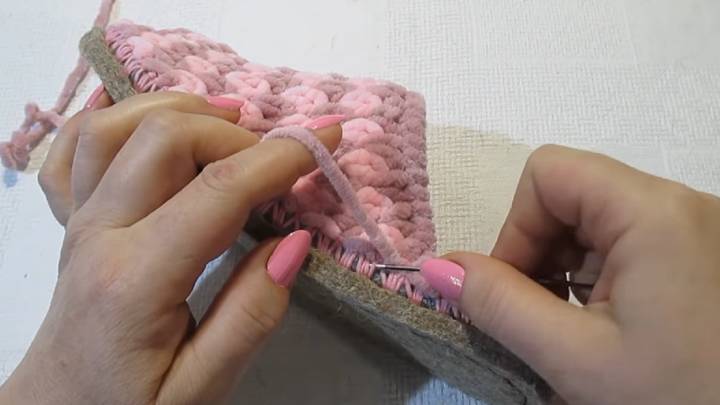 В конце выведите пряжу на изнаночную сторону тапки. Обвяжите соединительными столбиками ещё раз, но уже по внутренней стороне тапки.
