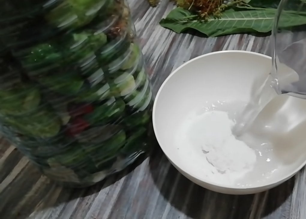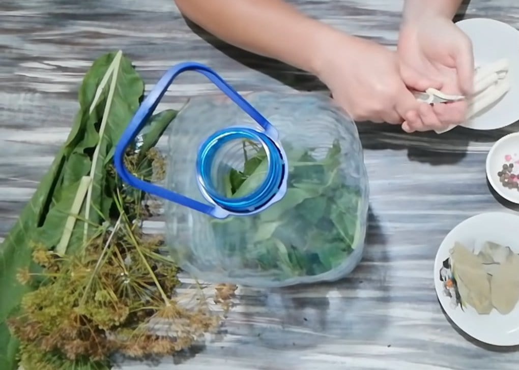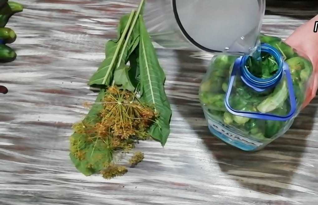Наполните бутылку на половину огурцами, добавьте еще немного специй и трав, а затем полностью заполните тару огурчиками. Для приготовления рассола разведите соль в теплой воде. Соль берется из расчета 100 гр на емкость объемом 3 литра.